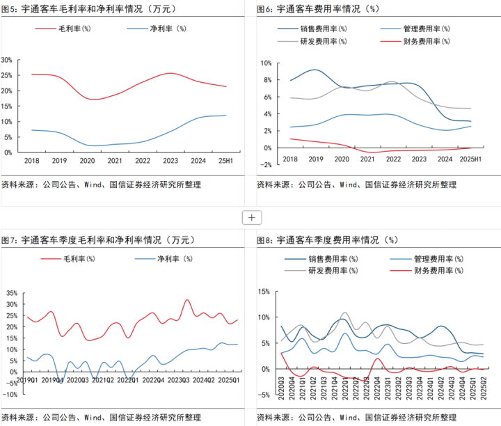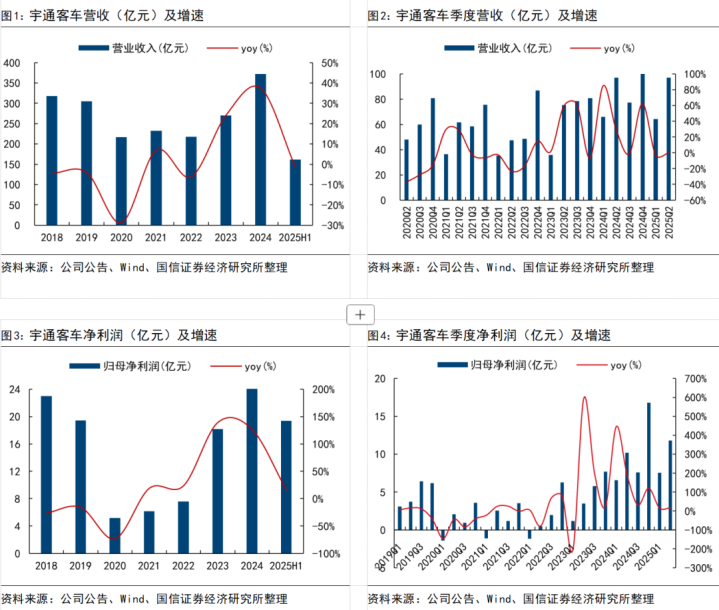 业绩概述:2025年上半年宇通客车实现销量21321辆,同比+3.7%,营业收入161.3亿元,基本持平,归母净利润19.4亿元,同比+15.6%;单季度看,宇通客车25Q2营收97亿元,同比持平,环比+51%,归母11.8亿元,同比+16%,环比+56%,扣非9.1亿元,同比+5%,环比+41%,整体来看,得益于国内企稳、出口业务放量、费用管控持续等因素,宇通客车业绩持续释放。
