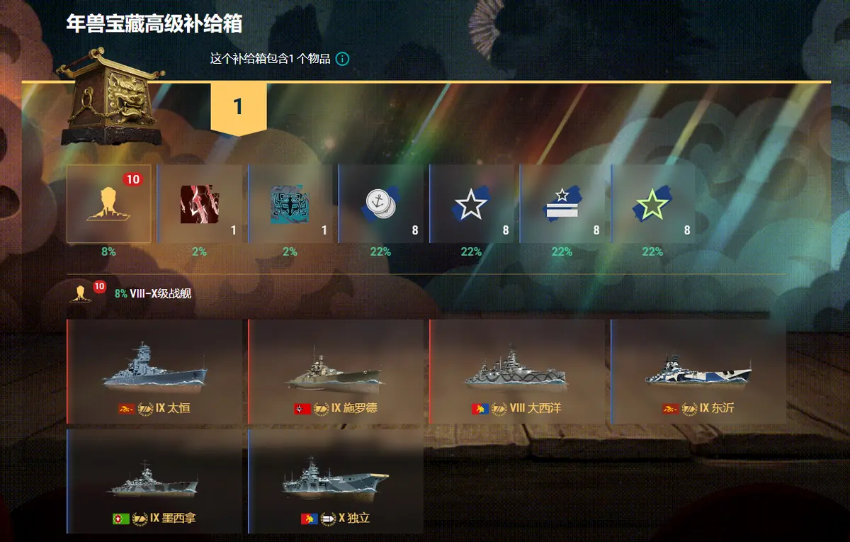 值得一提的是,这两款箱子有10%概率掉落“年兽宝藏”高级补给箱,里面能开出东沂、墨西拿、独立三艘全新战舰,这也是目前获取这三艘战舰的唯一途径,其中9级C系战列舰东沂实力强悍,12门356mm主炮搭配优秀的副炮和防空能力,在9级房里堪称战力天花板!