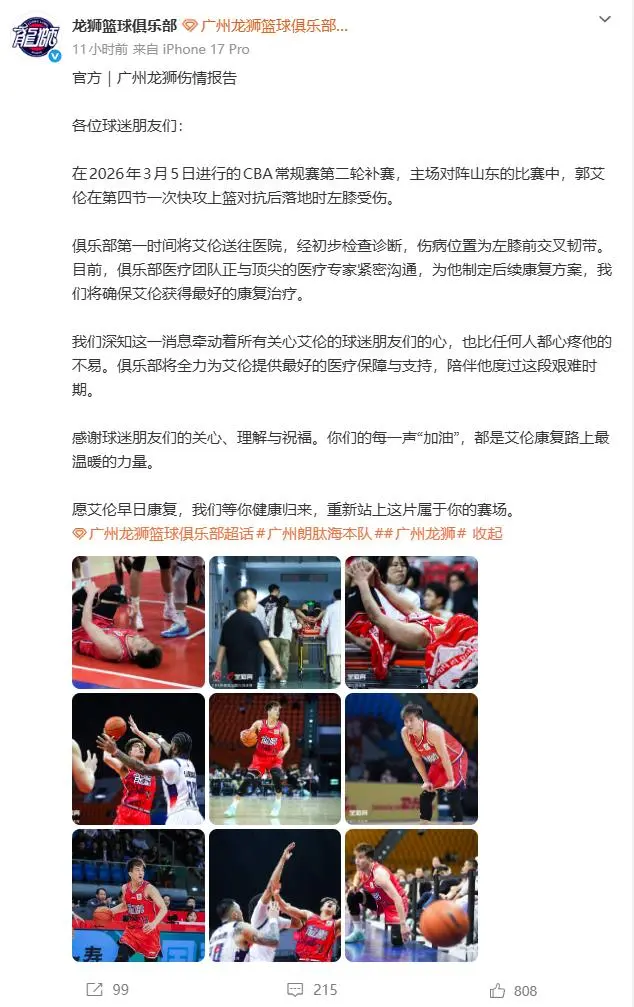 广州队将承担郭艾伦的全部治疗费用赛后第一时间,广州队就发布了声明,广州队表示:“各位球迷朋友们,俱乐部第一时间将艾伦送往医院,俱乐部医疗团队正与顶尖的医疗专家紧密沟通,为他制定后续康复方案,我们将确保艾伦获得最好的康复治疗。我们深知这一消息牵动着所有关心艾伦的球迷朋友们的心,也比任何人都心疼他的不易。俱乐部将全力为艾伦提供最好的医疗保障与支持,陪伴他度过这段艰难时期。愿艾伦早日康复,我们等你健康归来,重新站上这片属于你的赛场。”此外,广州队还感谢球迷朋友们的关心、理解与祝福。