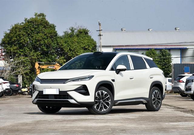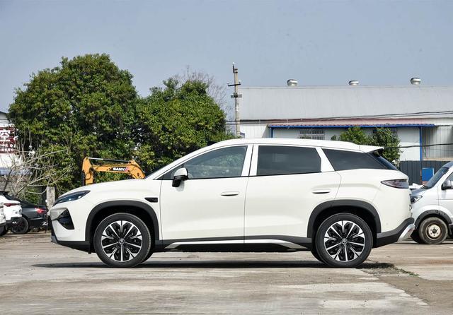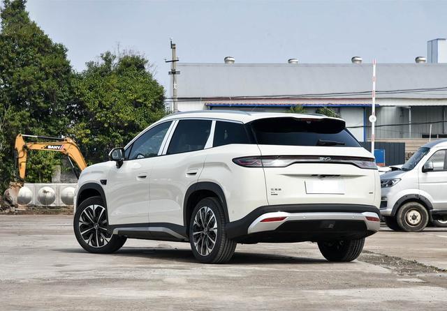 再来看车身侧面部分,宋Ultra EV的长宽高分别为4850/1910/1670mm,轴距达到2840mm,标准的中型SUV身材带来了宽敞的内部空间。半隐藏式门把手与悬浮车顶设计,不仅降低了风阻,还强化了整车的运动感与科技感。前后轮拱上方的内凹筋线,为车身营造出强烈的肌肉感,溜背式的造型设计则让侧面线条更加流畅舒展。