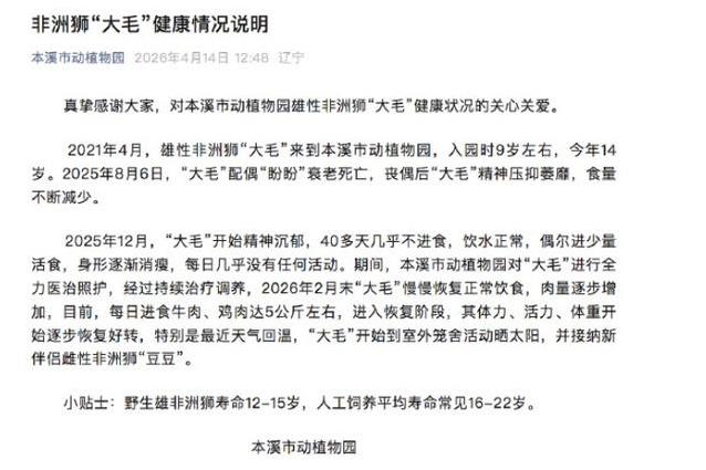 4月14日,辽宁本溪市动植物园就一只雄性非洲狮的健康状况发布了说明。这只狮子名叫大毛,2021年4月来到园内,当时大约9岁,如今已经14岁。它的配偶盼盼在2025年8月6日因年老去世,此后大毛出现精神不振的情况,食量也逐渐减少。