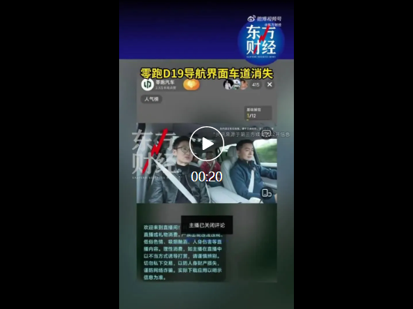直播画面显示,当时车辆正在高速路段行驶,中控屏上仅显示车辆模型,车道线、其他车辆等关键信息全部消失。在导航界面bug出现后,零跑汽车直播间直接关闭了评论区,用户无法发送评论互动。直播画面中,零跑汽车CEO曹力也频频看向中控屏,神情略显紧张。