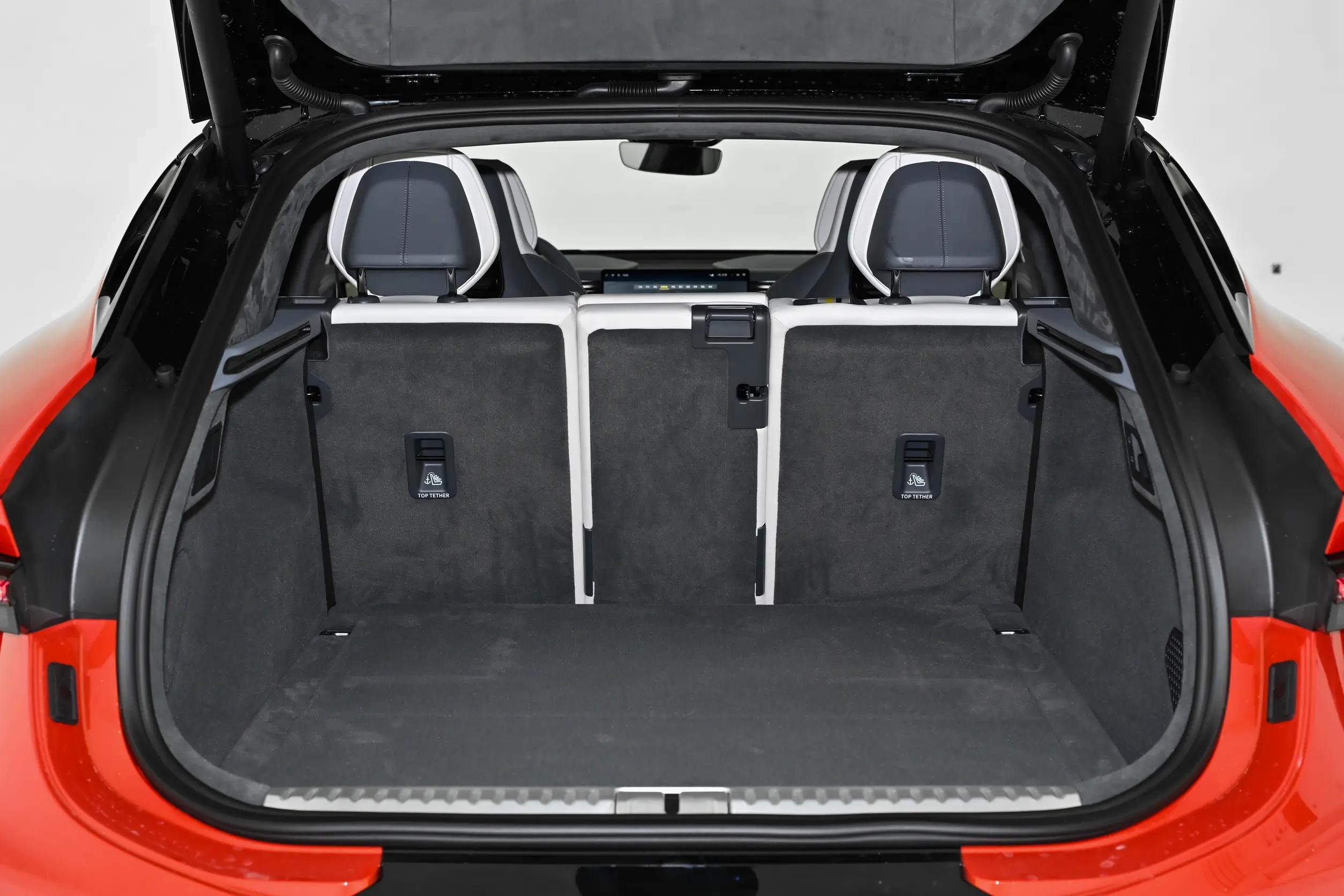 转到车身侧面,比例协调是最大的特点。宽大低矮的车身姿态,营造出了一种贴地、稳健的视觉效果。车顶线条从B柱之后开始优雅地下滑,形成一个大溜背的造型,但下滑的弧度经过了精心计算,以确保后排乘客的头部空间不受过多影响。悬浮式车顶设计、隐藏式的电动车门把手,都让侧面的光影曲面显得比较干净、完整。轮拱与侧裙处采用了粗壮的黑色防擦饰板,为这款强调公路性能的SUV增添了一丝野性与力量感。轮毂是双五辐的熏黑样式,内部显眼的红色刹车卡钳清晰可见,无声地诉说着其不俗的性能潜力。