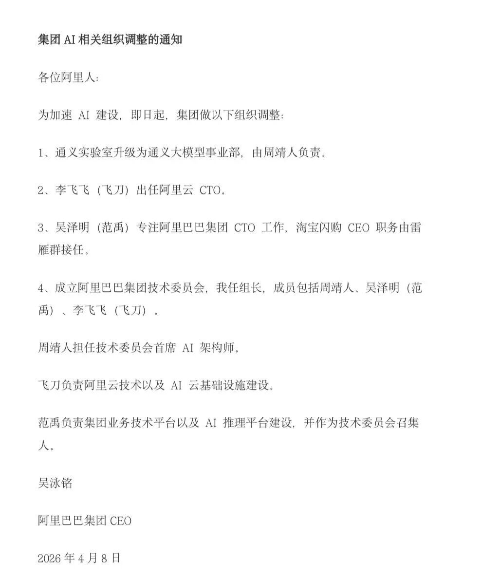 根据内部信,李飞飞出任阿里云CTO,吴泽明(范禹)专注集团CTO,淘宝闪购CEO职务改由雷雁群接任,周靖人担任技术委员会首席AI架构师。