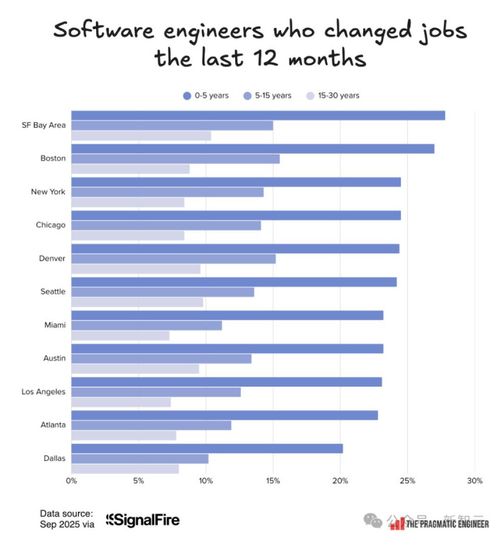 SignalFire的数据显示,过去12个月内,湾区的软件工程师跳槽率最高。