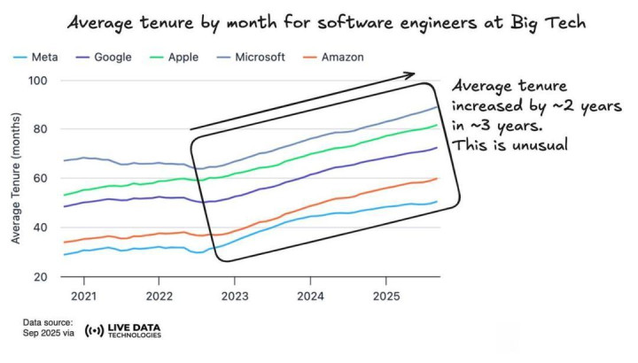 像今天这样长的平均任期,过去从来没有科技大厂中看到过。这可能是大厂不再积极招聘的结果,也可能表明大厂软件工程师不太可能换工作。