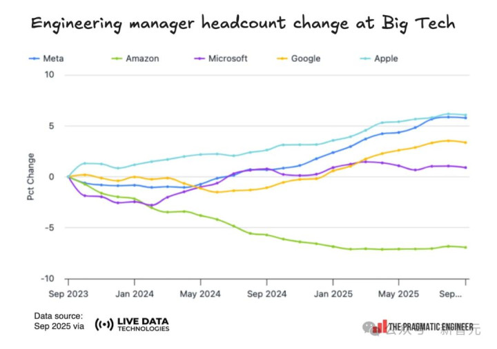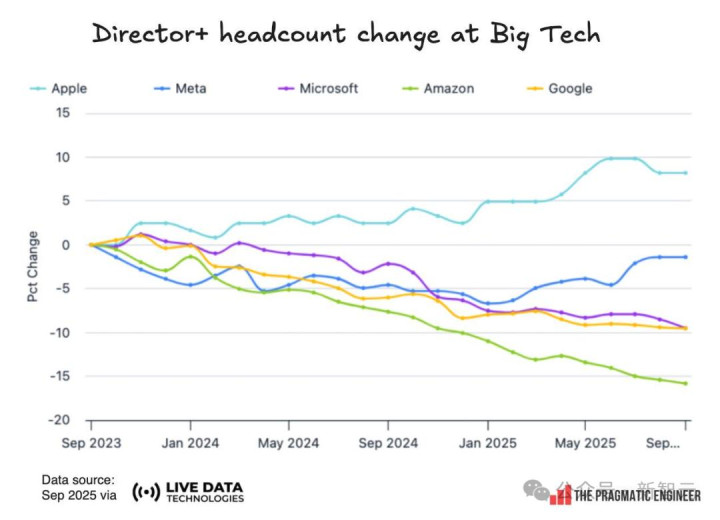 看看总监及以上职位(总监、高级总监、工程副总裁),除了苹果公司外,所有大型科技公司都削减了高管人数: