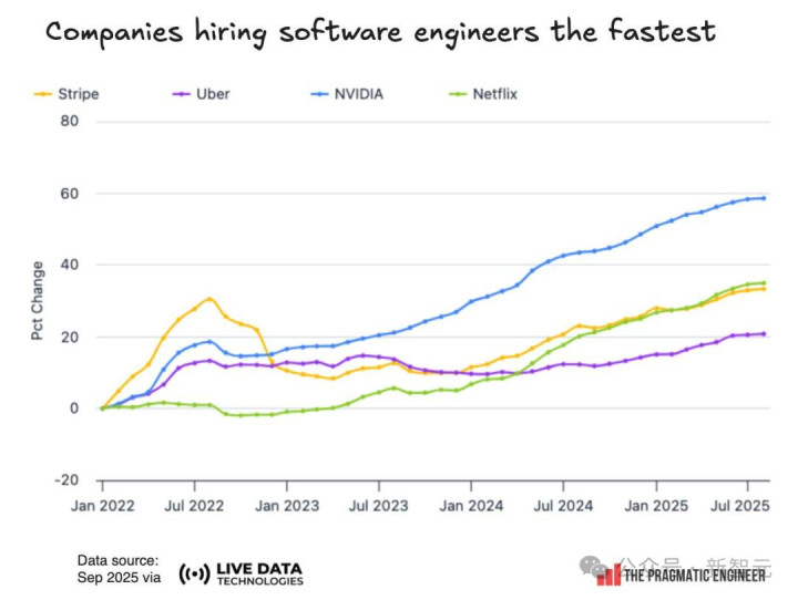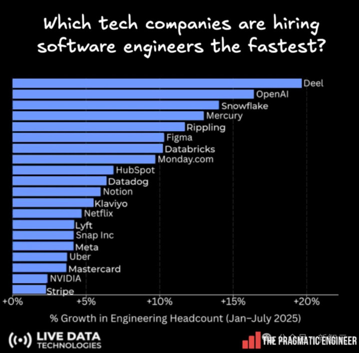 Stripe:2022年激进扩张,2023年因科技寒冬放缓,随后又重启增长。截至2025年8月,工程师人数比2022年初高出32%。