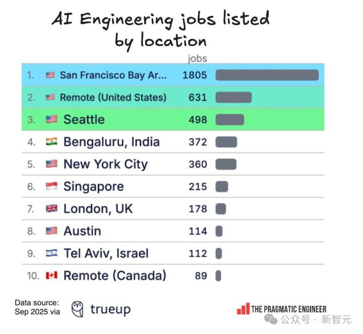 绝大多数AI工程职位都集中在美国湾区(Bay Area),其数量遥遥领先于其他地区: