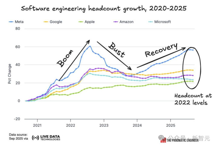 2020-2025年,美国科技五巨头的人头数增长统计数据