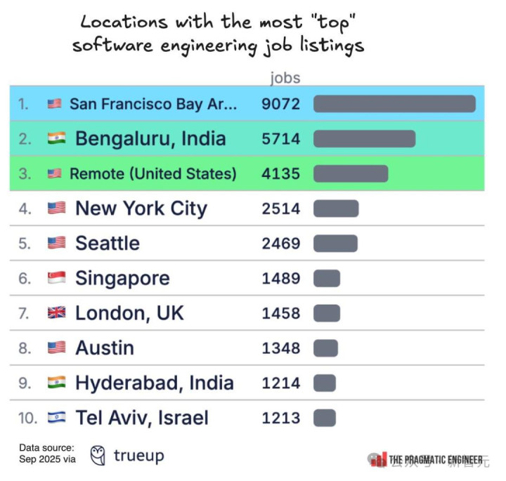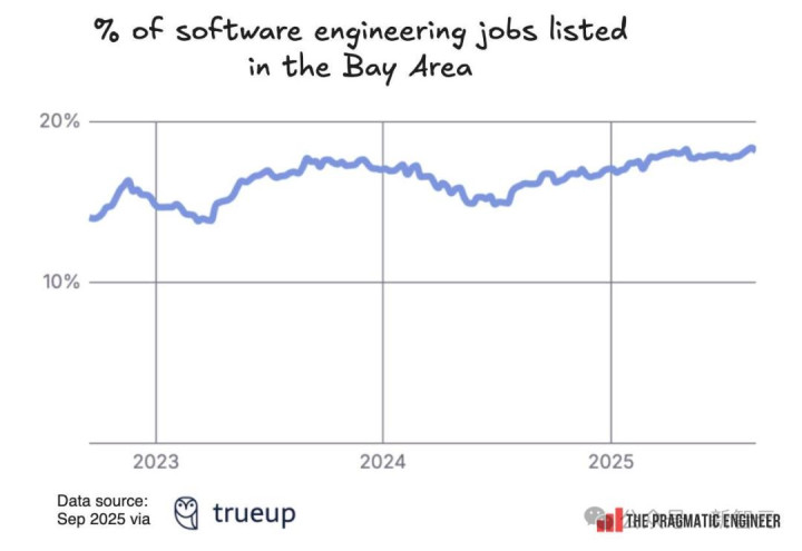 根据TrueUp数据,旧金山湾区的岗位占比接近20%,稳居全球科技招聘的核心。