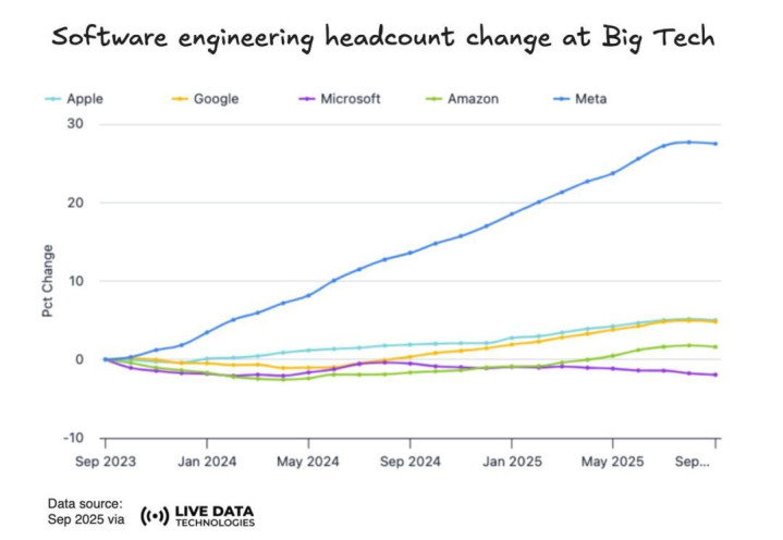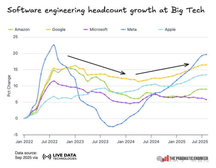 Meta:招聘强势反弹。2023年砍得最狠(降约-12%)后,Meta现在招工程师最多。