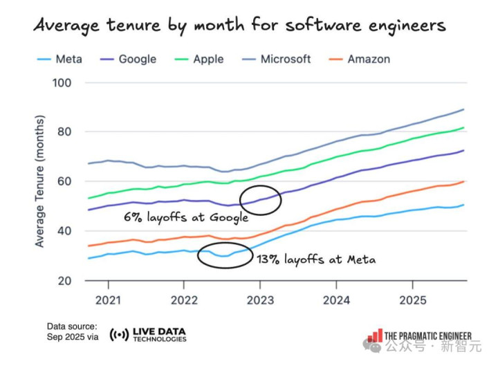 春江水暖鸭先知,大厂员工对行业冷暖最敏感——他们的平均任期急剧上升,是当下就业市场的直观指标。