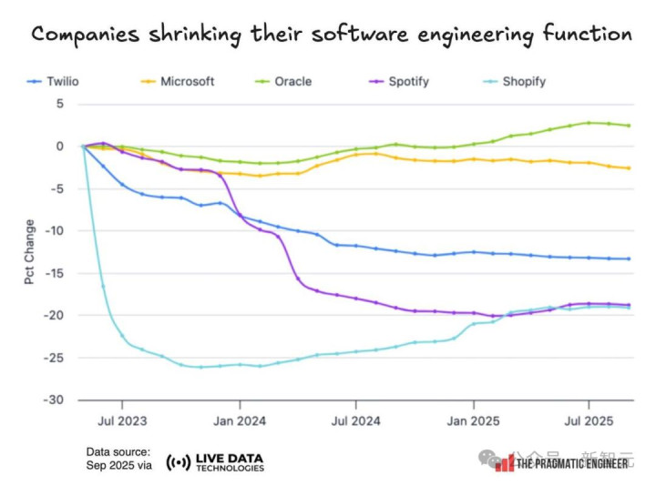 Shopify:2023年初大幅裁员,工程师人数骤减。截至2025年8月,依然比2022年初少22%,且没有复苏迹象。不过,公司正计划在2025–26年招收1000名实习生,如果这些人转正,工程团队可能在未来一两年内回暖。