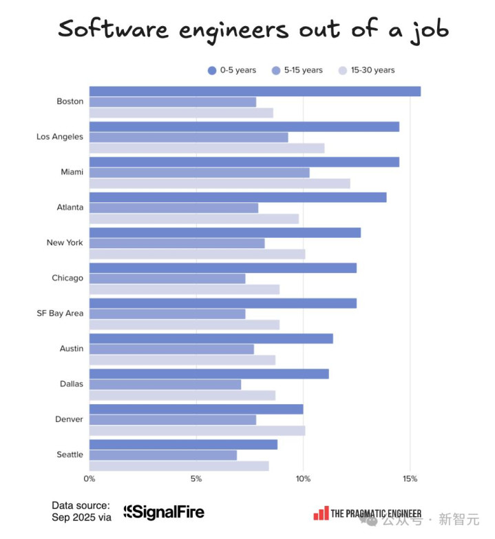 SignalFire的数据显示,美国0–5年经验的软件工程师失业率接近15%,集中在波士顿、洛杉矶、迈阿密和亚特兰大等城市。