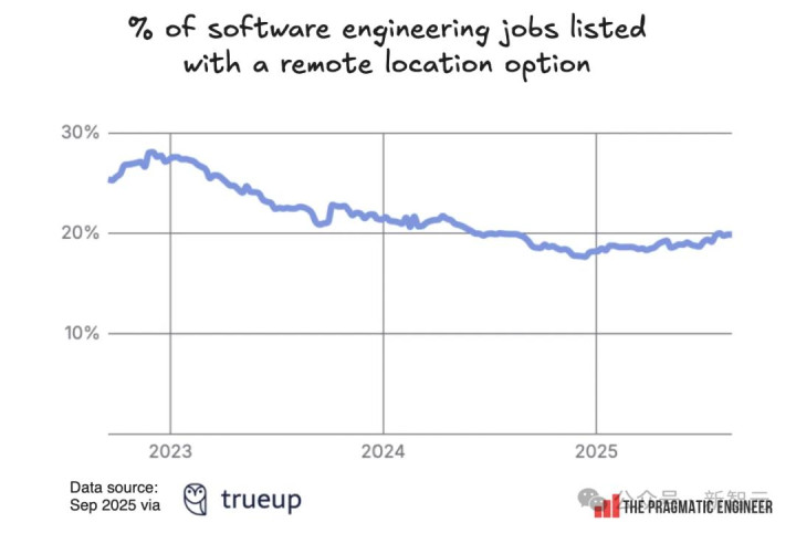 在TrueUp上,远程岗位比例已从一年前的25%下滑至20%。