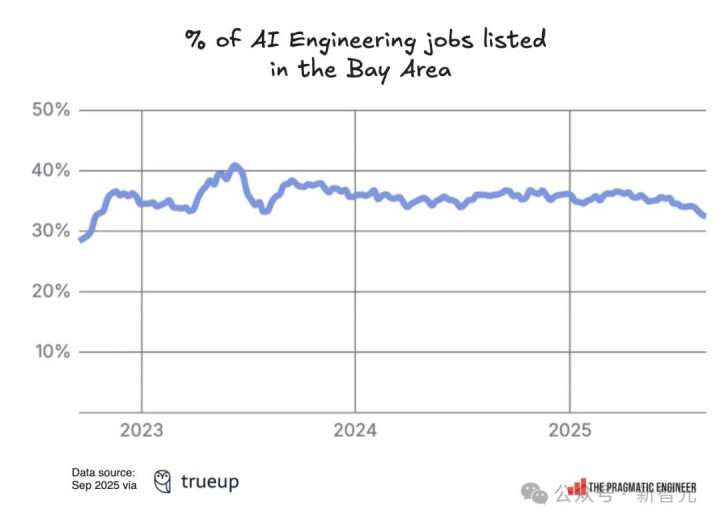 在TrueUp网站上,大约三分之一的AI工程师职位都来自湾区。