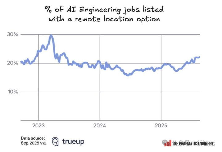 AI工程岗位依旧供不应求,因此远程机会反而略有上升。但这种宽松可能是阶段性的,一旦市场供给改善,远程比例或许还会收紧。